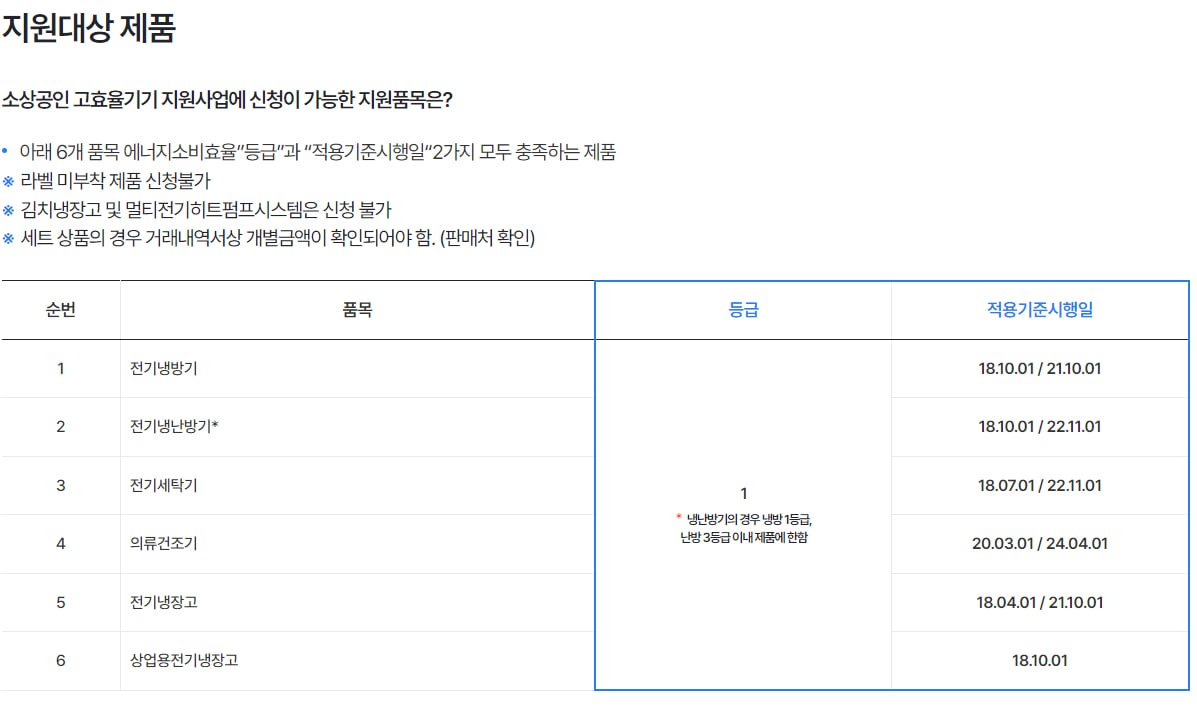 지원대상제품[출처: 한전 소상공인 고효율기기 지원사업 홈페이지]