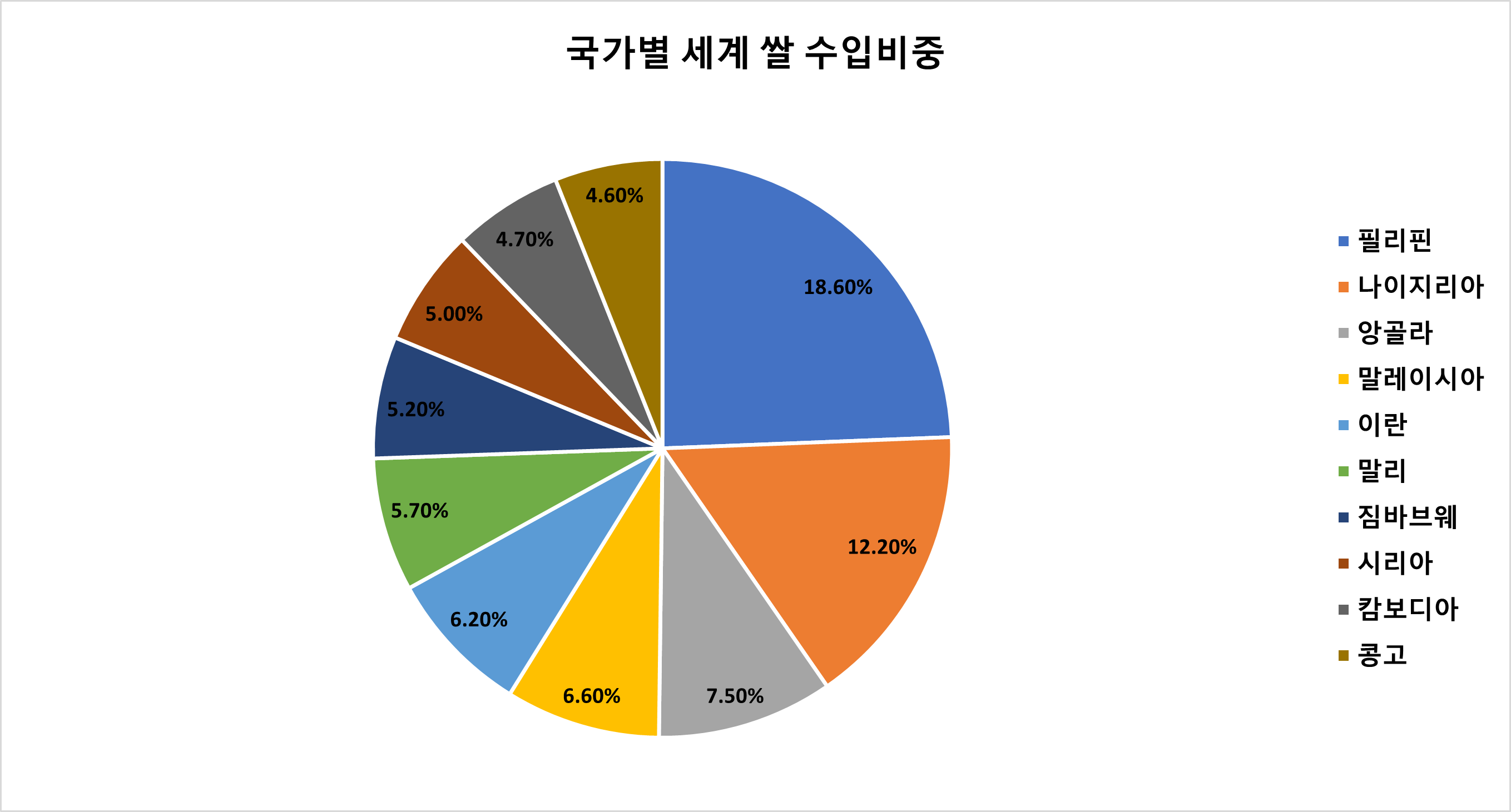 2022년 기준 전 세계 쌀 수입국 순위입니다. 쌀의 품종에 따라 비중은 달라 질 수 있지만 대부분 수입을 많이 하는 나라는 동남아시아, 아프리카 지역의 국가들이 수입을 많이 하고 있음을 알 수 있습니다.