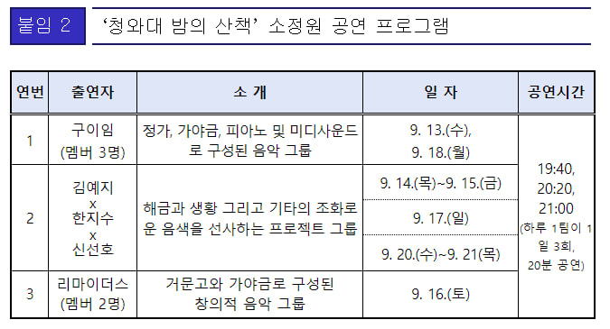 환하게 밝혀진 대정원을 시작으로 본관(내부관람포함)과 구 본관터, 대통령이 거주했던 관저 웅장한 반송이 기다리는 녹지원까지 청와대의 고즈너한 밤 정취를 느낄 수 있는 프로그램이 준비되어 있습니다. 아늑한 숲 소정원, 도심의 야경을 그대로 느낄 수 있는 관저길 웅장한 반송옆 녹지원 숲길은 밤이 되면 낮의 소음을 덜어내고 아름다운 별빛을 머금은 공간으로 재탄생합니다. 잔자난 공연과 별빛 조명까지 밤의 청와대에서 일상 속 여유를 되찾는 기쁨을 누려보세요. 이번 야간 개장에서 진행되는 공연프로그램은 붙임 사진과 같습니다. 공연시간에 맞춰 코스를 구성하는 것도 야간 청와대의 분위기를 느낄 수 있는 좋은 방법입니다.