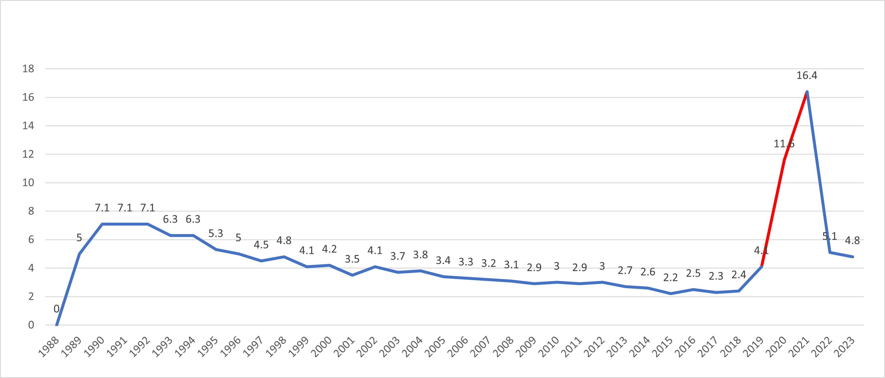 최저임금은 1988년 2,000원으로 시작하여 매년 평균 4.6% 인상되었으며 2023년 현재 9,620원이다. 가장큰 인상율을 보였던 해는 2019~2021년 사이로 당시 11.6%, 16.4% 두차례 인상율이 역대 최저임금 인상율중 가장 큰 인상율을 보였다.
